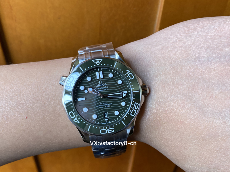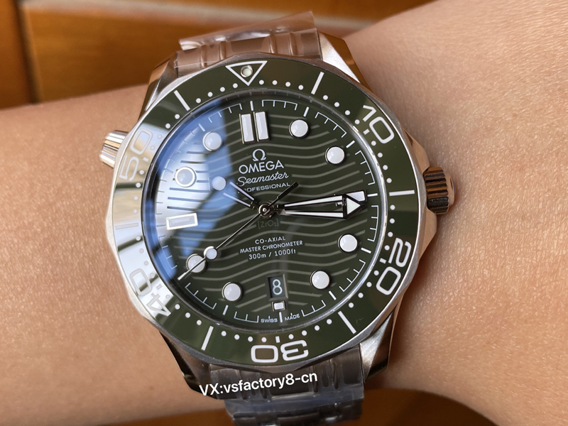 3:VS工廠購入了歐米茄綠面海馬300米正品開版,表圈上,同步了正品一致綠色陶瓷表圈,飾以白色琺瑯潛水刻度,字圈刻度不易磨損掉色,棘輪式倒計(jì)時(shí)表圈逆時(shí)針單向轉(zhuǎn)動(dòng)。表盤這方面,拋光綠色陶瓷表盤,激光鐫刻波紋圖案,6點(diǎn)鐘位置設(shè)有日歷窗口,鏤空指針和浮雕小時(shí)刻度經(jīng)鍍銠處理,并覆以Super-LumiNova夜光涂層,藍(lán)綠雙色夜光,分針綠色夜光顯示配合表圈綠色夜光點(diǎn)用于潛水氧氣倒計(jì)時(shí)。