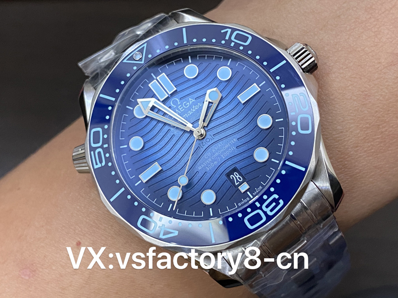 5:值得一提的是這款歐米茄海馬300復刻表的漸變冰藍表盤,獨有的夏日藍色調深淺變換,它在波浪紋理的陶瓷盤面色調上,呈現出既有冰藍,又有深海幽藍,VS廠一步還原到位,其細節工藝完美同原版,VS廠對此進行了仔細的研究和還原,確保了表盤顏色的層次感和漸變效果,細節上的處理同樣令人驚嘆。表盤上的刻度和指針采用了高品質的夜光材料,保證在光線不足的環境下仍能清晰讀取時間。