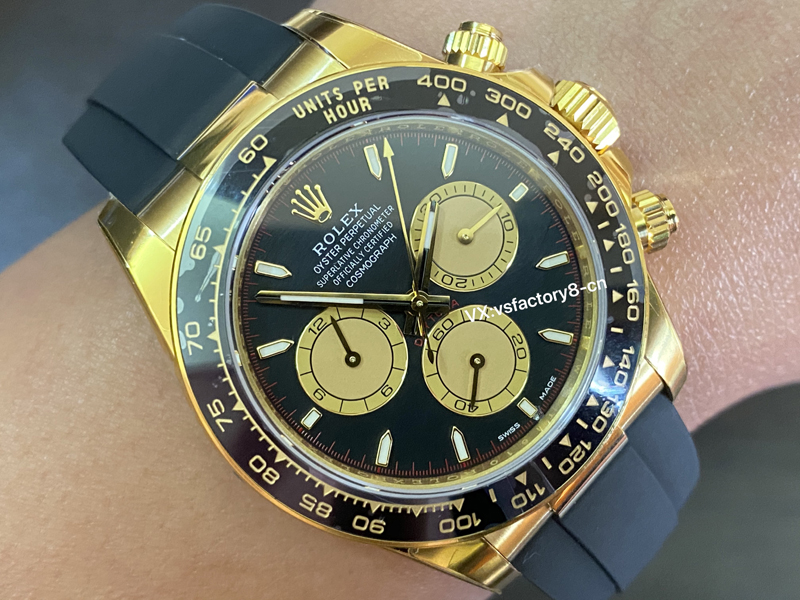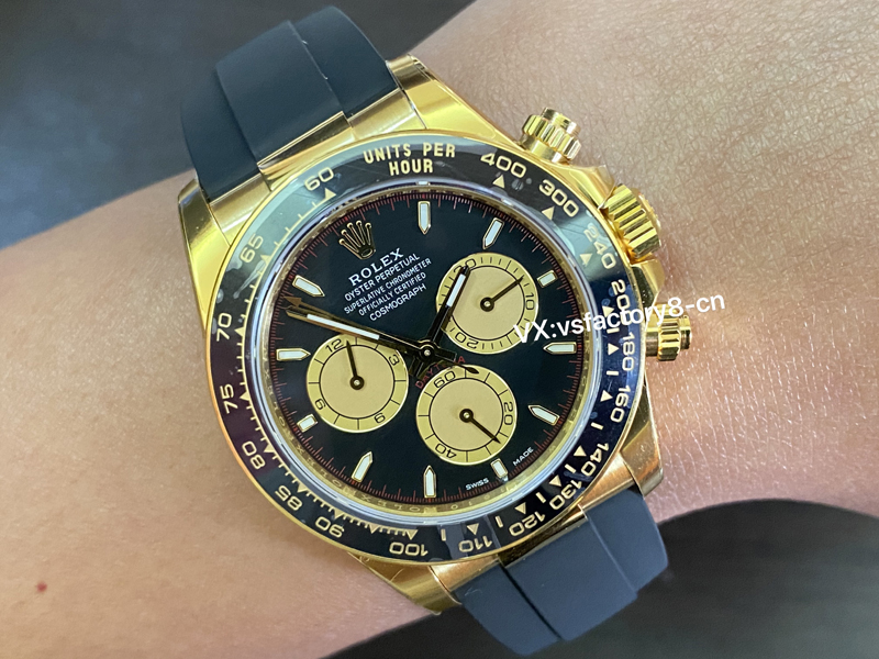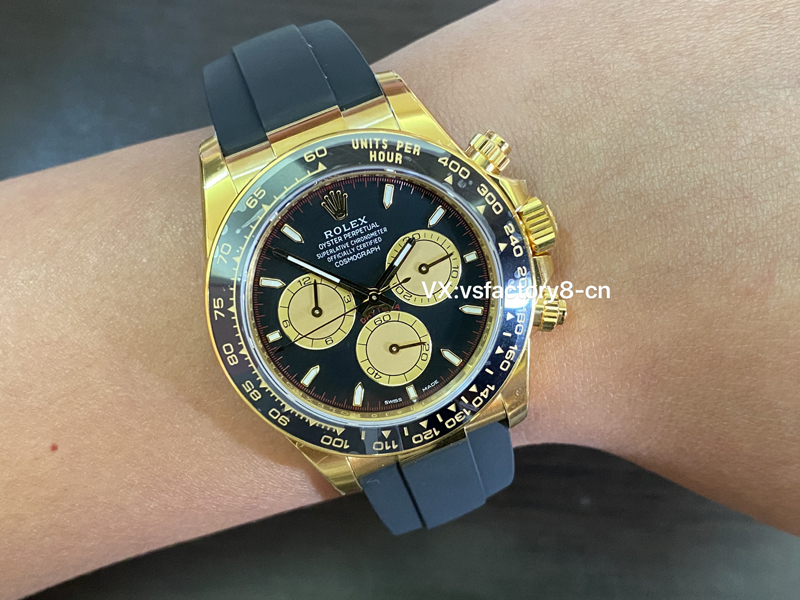 2:在細節上,VS廠將勞力士小怪獸迪通拿的工藝發揮到了極致,表圈采取了自主燒制的黑色陶瓷材質,這一點做到了對版,陶瓷圈計時刻度細節非常精湛,一致原裝金色刻度,并且不會出現顆粒瑕疵,平面整潔,表圈邊緣也是新款迪通拿的改變,增加了一個黃金圈,VS工廠將毫無疑問的還原一步到位!