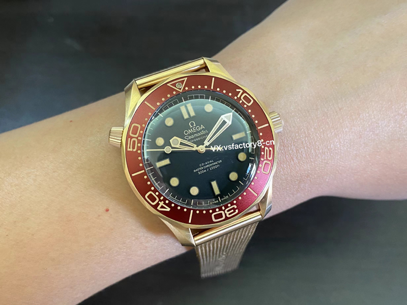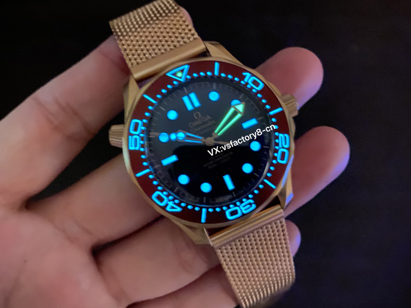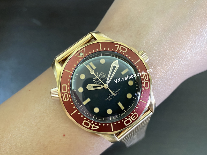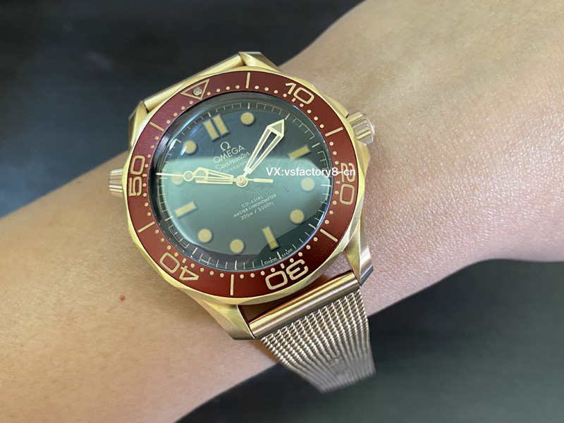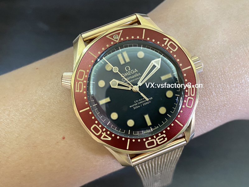 2:表圈還原展現了VS廠的超強技術,此次VS廠在復古青銅金無暇海馬300米的表圈進行了原裝開版,還原了正品一致草酸陽極氧化鋁材質設計,特別是表圈上櫻桃紅,是最注重的一點,取決了整表的工藝,而VS廠不懈努力的進行開版,挑出最接近正版的表圈進行組裝,達到了既不會色差也不會一眼假,表圈的潛水計時刻度細節處理非常精湛,并增加了夜光效果,非常完善。