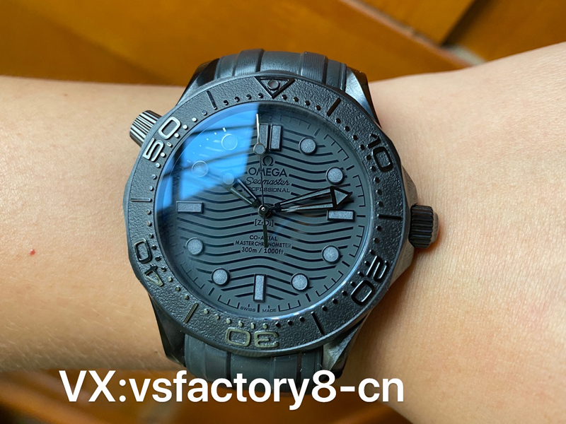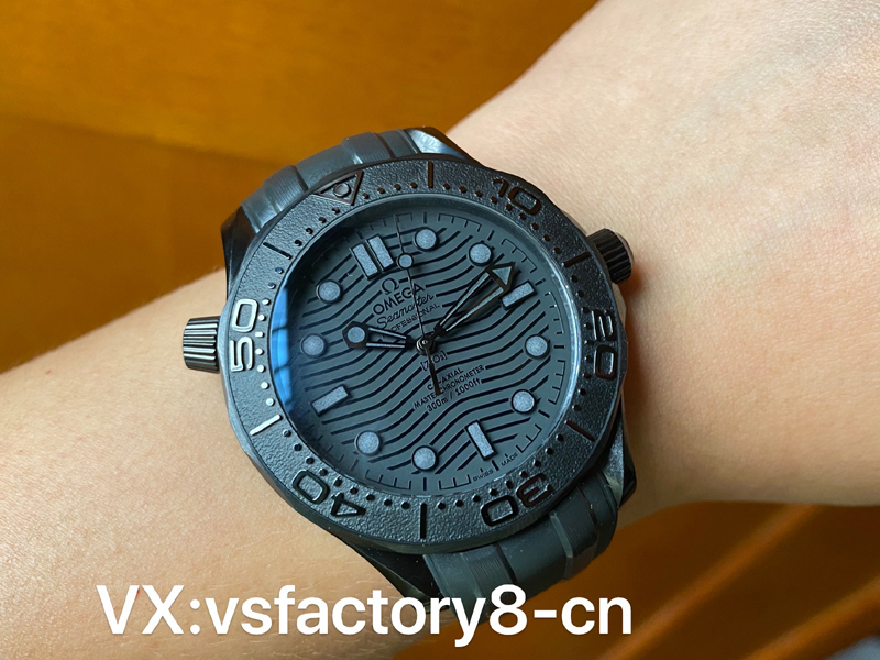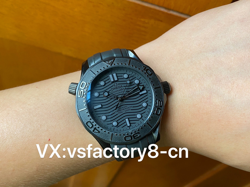 4:VS廠歐米茄全陶瓷墨黑版海馬300米表盤的還原設計也相當考究,波紋圖案表盤采用陶瓷材質制成,鏤空指針,均覆有炭黑色Super-LumiNova夜光涂層,表盤英文印刷細節(jié)處理的非常立體,整體看起來非常完善,同原版一致工藝處理,讓表友紛紛贊嘆做工細節(jié)非常完美。