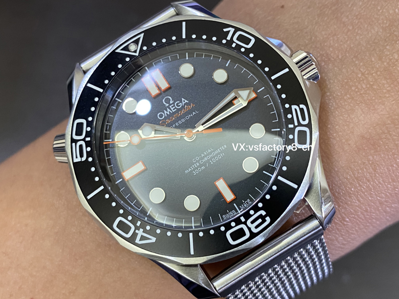 4:VS廠歐米茄無暇黑橙針海馬300米在表盤上保留了原版一直做工細節(jié),表盤采取了原版一致黑色鋁制復(fù)刻還原,中央秒針覆橙色亮漆,3 點、6 點、9 點、12 點時標亦以橙色勾勒,與黑盤形成強烈對比,“Seamaster” 字樣同樣采用橙色,表盤上的時標和指針都有瑞士夜光粉處理,不僅增強了其質(zhì)感,也提高了在水下環(huán)境中的可讀性。