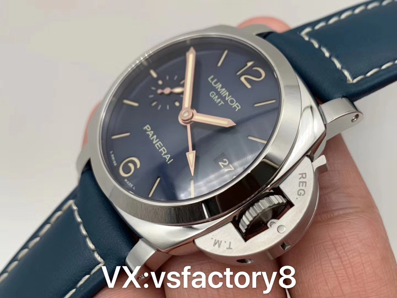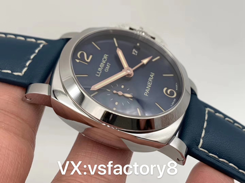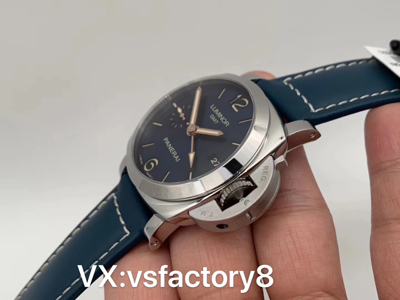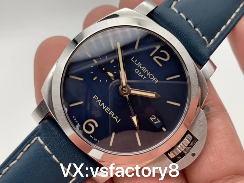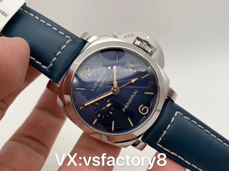 VS廠官網的沛納海PANERAI BLUE DIAL藍色表盤GMT自動腕表PAM00688,異地時間GMT兩地時間 ,精鋼拋光表殼 ,帶滾軸保險護橋表冠 ,藍寶石鏡面 ,藍色日暉紋表盤 ,鍍金表針 ,超強夜光 ,自主研發P9001機芯(擺的位置和正品一致了,時針快調,日歷通過時針調節,GMT針12小時走一圈,螺絲孔位置和原裝一致,機芯厚度也一樣了) 牛皮表帶,精鋼針扣, 42mm !