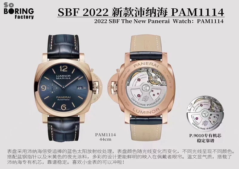 2022年 (VS工廠)旗下SBF廠新款沛納海PAM1114表盤采用沛納海倍灰色太陽放射紋處理,表盤顏色隨光線變化而變化,搭配藍鋼指針以及米黃色的夜光涂料,多彩的設計更能鮮明的映入在佩戴者眼簾,溫文顯氣質,VS廠沛納海專有機芯,靠譜穩定。喜歡小金表的可以沖啦!