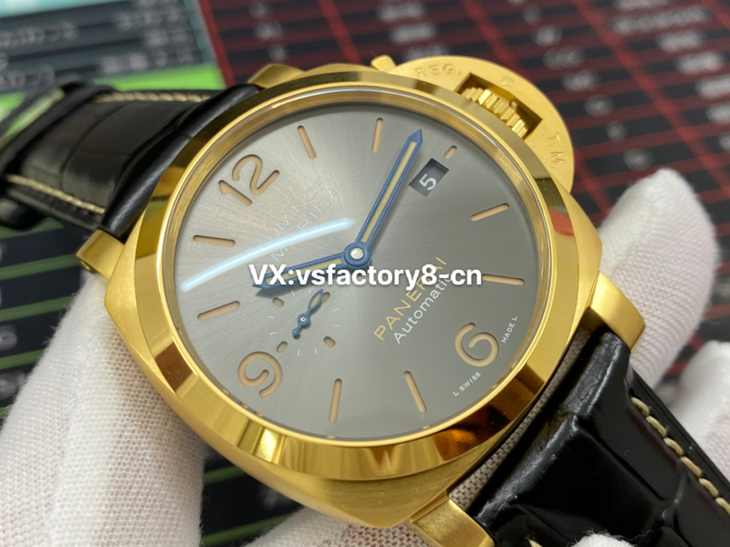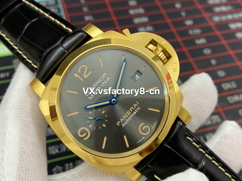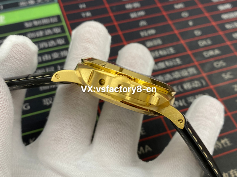 VS廠復刻表外觀其實跟其他沛納?;緵]什么區別,44mm的表徑,外觀也是精鋼進行了真空電鍍,電鍍了18K金。