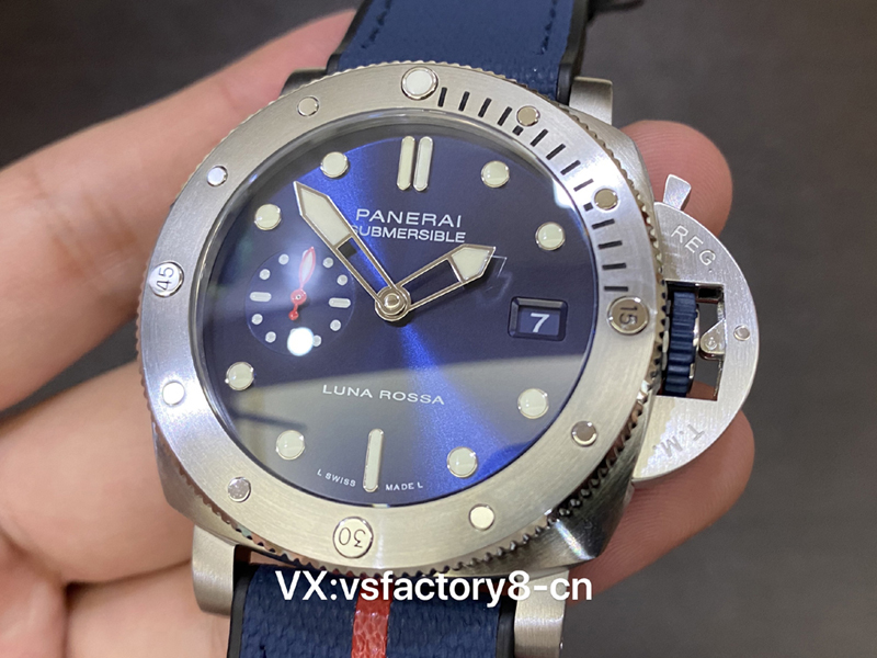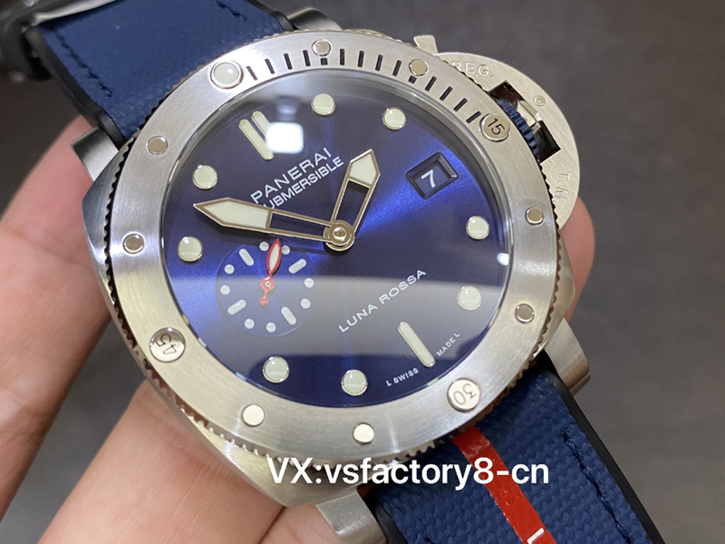 VS廠沛納海1391的字面采取藍(lán)色面,同正品沛納海1391做了太陽放射紋處理,會(huì)隨光照角度變化。