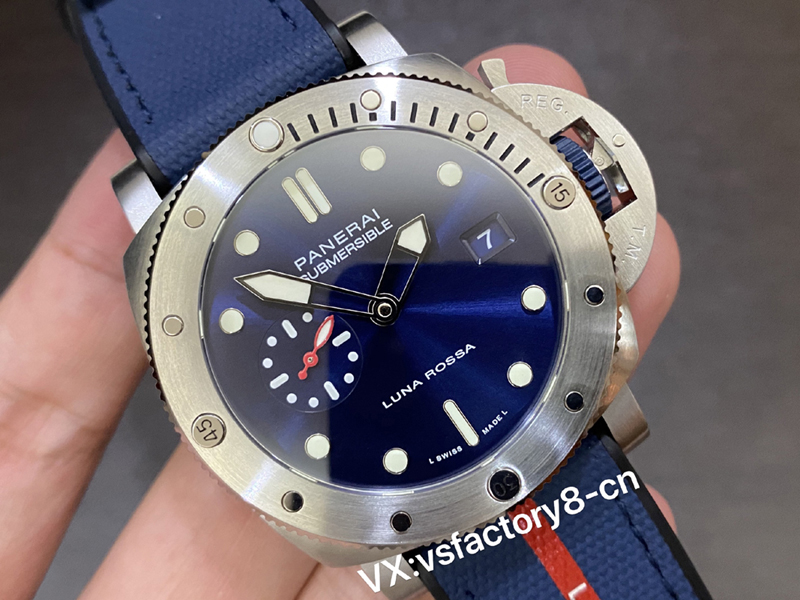 盤面9點(diǎn)鐘位置設(shè)有小秒盤,魚雷指針做成紅色,醒目,也為藍(lán)盤更添動(dòng)感,表盤上還帶有Luna Rossa名稱,以展現(xiàn)與該帆船隊(duì)的合作。