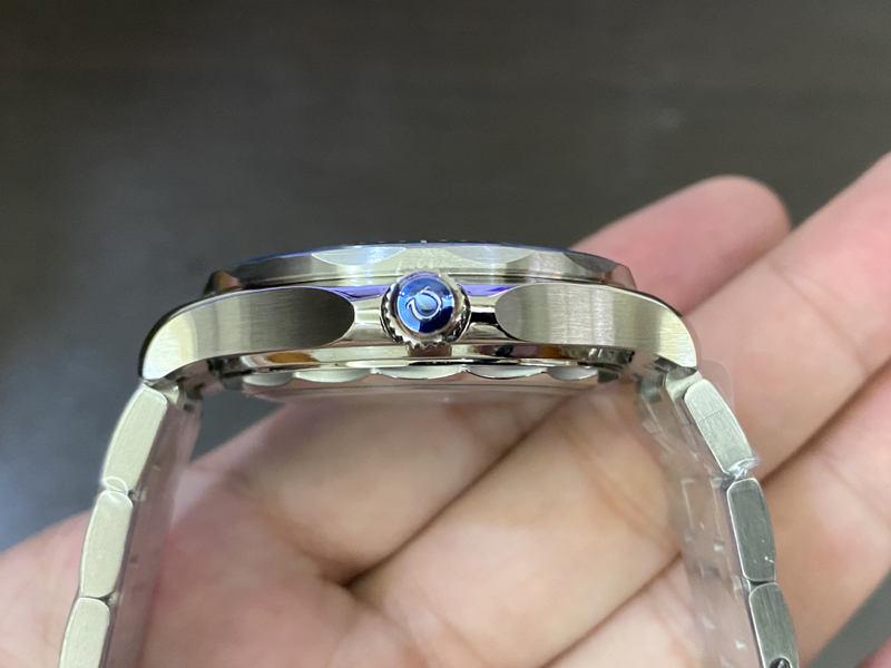 316L精鋼拉絲表殼局部拋光處理,表圈采用藍色陶瓷,飾以白色琺瑯潛水刻度,字圈刻度不易磨損掉色,棘輪式倒計時表圈逆時針單向轉動。