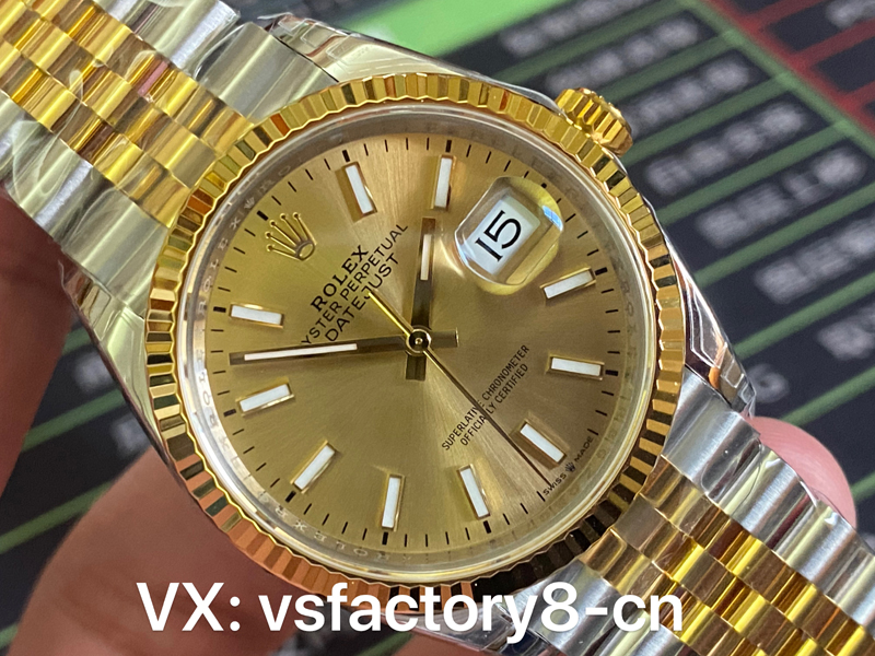 VS廠勞力士間金日志36M“面”好,表盤(pán)太陽(yáng)紋清晰細(xì)膩,淡雅光澤,隱約而獨(dú)特,隨著手腕擺動(dòng)顯不同光澤,表盤(pán)是唯一可以跟正品互換的版本。