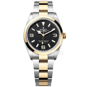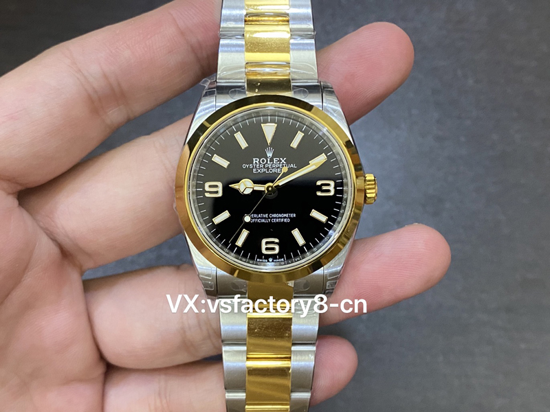 VS廠新款勞力士間金探險家采用904L精鋼鋼與真空電鍍18K斤材質,其中外圈、表冠與表帶中間鏈節(jié)采用18K金真空電鍍打造而成。